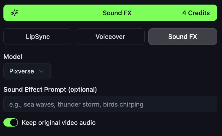 β’ π Sound FX β instantly add immersive sound design to any video choosing from Eleven Labs, Pixverse or Mirelo.